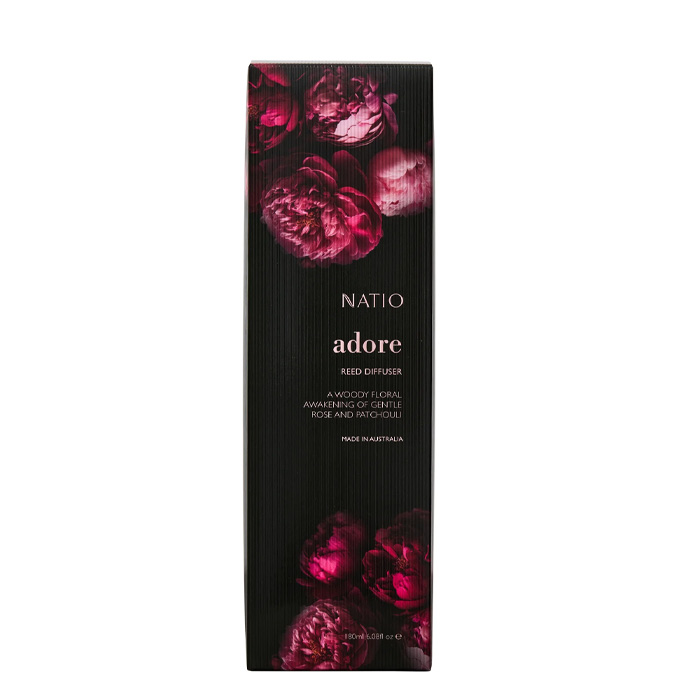 Elevate your space with the magical woody-floral aroma of this gorgeous Adore Scented Reed Diffuser. The sweetly tender scent of young Rose blooms harmonises with heady Patchouli flowers, a grounding presence of warm Amber provides a mindful counterbalance to hold space for comfort, care and appreciation. Aesthetically, the tinted, rippled glass vessel and 6 x black rattan wood reeds offer a naturally elegant home fragrance solution. Diffuses up to 6 months. Made in Australia.