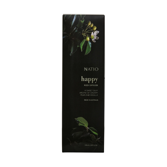 Infuse a sense of optimism into your surrounds with the sweet, silky aroma of this Happy Scented Reed Diffuser. Creamy, comforting Vanilla notes combine with candied, caramelised Pear; heady blooms of white Jasmine lighten and brighten with an effervescent floral freshness, a joyful celebration of the sweetness of life. Aesthetically, the tinted, rippled glass vessel and 6 x black rattan wood reeds offer a naturally elegant home fragrance solution. Diffuses up to 6 months. Made in Australia.