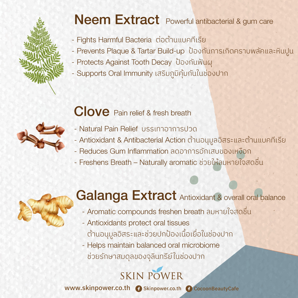 - Azadirachta Indica Extract* (Neem) – Traditional Ayurvedic ingredient; fights bacteria, prevents plaque buildup, and supports gum health.